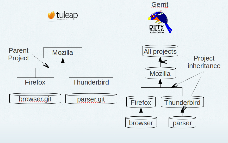 In following sections, we will take the example of an imaginary Tuleap project “mozilla” with two git repositories “thunderbird” and “firefox”.